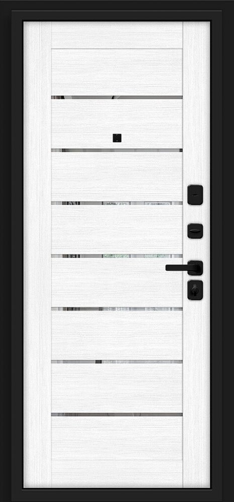 Порошковое покрытие Муар Серый Экошпонированная панель МДФ 10 мм (дизайн ФЛС). Цвет "ясень графит". Объемная фрезеровка. Вертикальная вставка из черного глянцевого лакобеля. Наличник МДФ 80 мм.